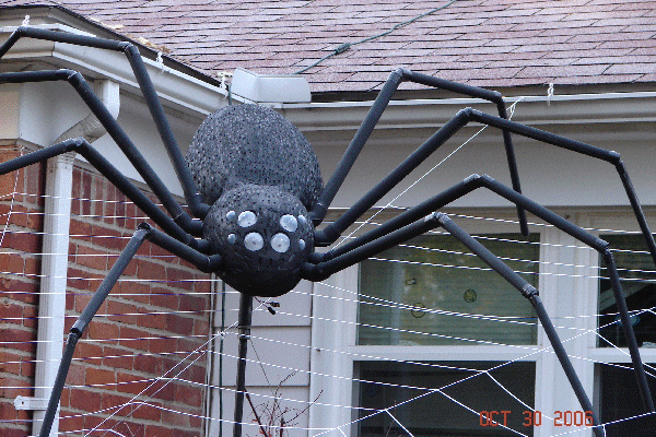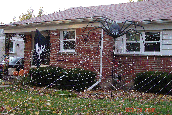 For 2006 we decorated the house with some interesting hand made items. The biggest was the spider web. We made it from 900 feet of nylon mason twine and super glue. It was made the same way a spider makes it's web. Starting with the main supports and then the spiral. As the spiral was made it was knotted to each support line then superglued. It ended up being 25' in diameter.