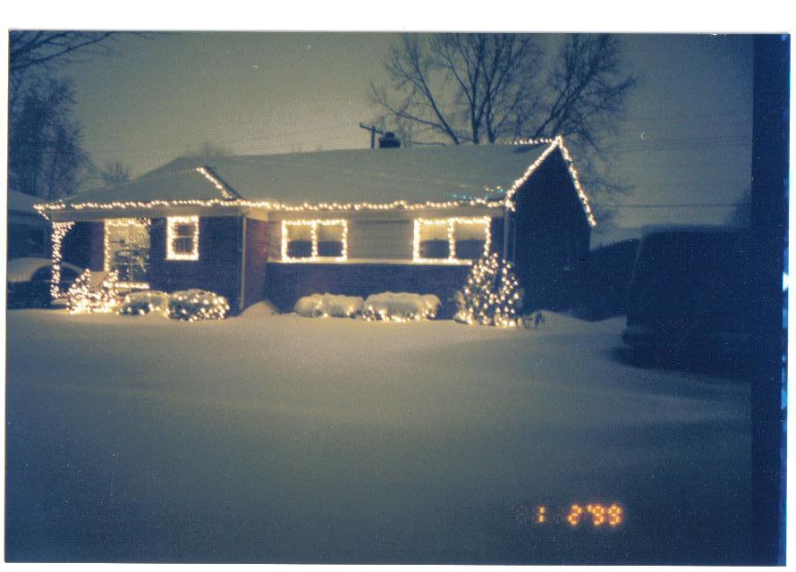 1998 was the year when changed a lot in our house. It was my first son's first Christmas and we had only been in our house a year. This was the year my wife said I should put some ilghts on the house. That was the last time she told me to do that(Insert evil laugh). We didn't have a lot of money..I guess we still don't... We did the best we could with what we had. This first year was simple and clean looking and looked great with the snow. I don't remember the light cout but I guess it was around