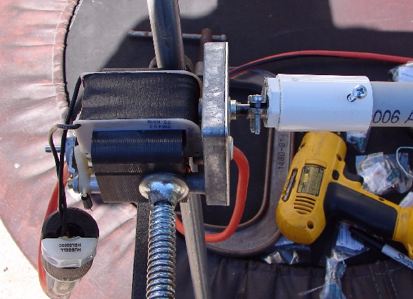 This is the business end of the winder. I just used what I had on hand to get it to work. The gearmotor is on that I bought on Ebay, it is 25 RPM and was just about the right speed. To adapt the shaft to 3/4" PVC a 3/4 PVC slip fit to 3/4" female thread adapter was used. This slides on the PVC pipe then a 1/2 X 3/4 bushing is threaded into it. Then into this a 1/2" romex clamp is screwed into the bushing and then clamped onto the shaft of the motor.