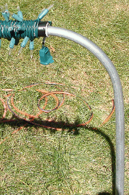 This is the other end of the winder. It is simply a piece of 1/2 EMT thinwall conduit bent and pushed into the ground. with the bearing surface inside the PVC it allows the arch to be wrapped all the way to the end.
