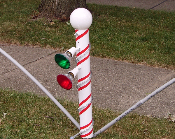 The front yard, like most, has a side walk on it and there are a lot of things on display in it along with over a hundred extension cords. It's not the best place to be running around in come Christmas time. So a fence is being made to be a point of interest as well as a barrier. Above is a picture of the layout. Between each section is going to be a Chrismassy looking post. The posts will be 2 1/2' high with a round globe light on top. They have a red candycane stripe from bottom to top. the back of each pole will have 2 outdoor spotlight fixtures to light up the grass in both red and green. As you can see each section is divided into 8 individual sections. Each of the small sections is going to have it's own LOR channel so the fence will look like the leaping fountains that you see at Disney or other locations.