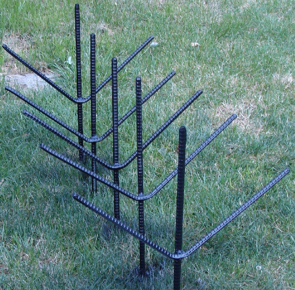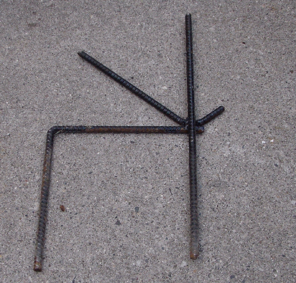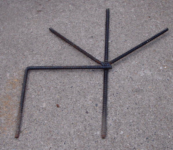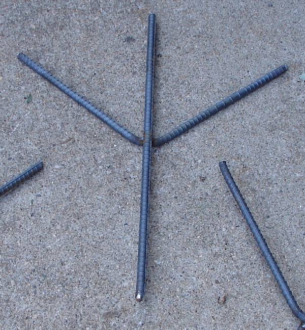 These stakes were made from 1/2 reinforcing rod. It was cut into 24" sections. Half of them were bent at 90 deg in the middle. I used an arbor press with a bending jig. Then I welded them together. They will be driven 12" into the ground so the V is flush with the ground. Then the north poles will be slid down through the 1/2 " internal PVC
