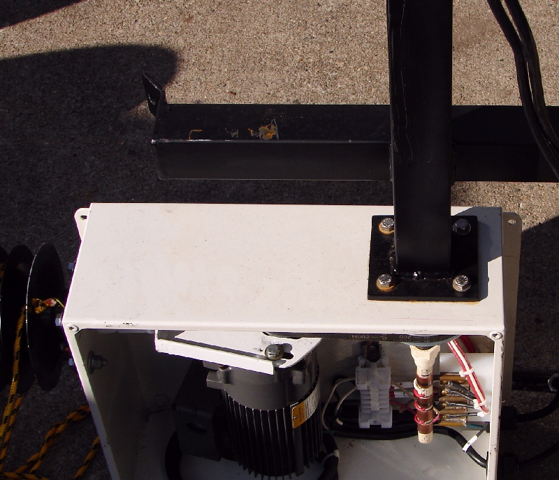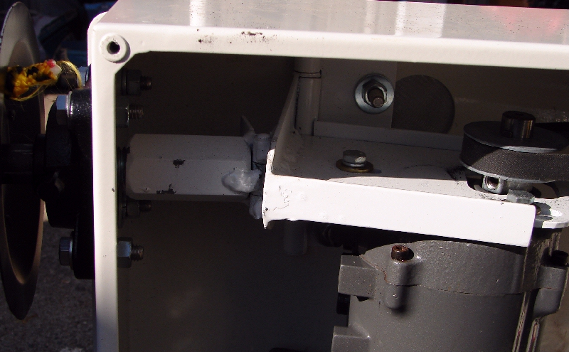 This is the adjustable motor mount. On the right side is a homemade rope pulley this is welded to a 3/4 " - 10 X 5" bolt. This bolt is threaded into a 3/4" - 10 coupling nut. This nut is welded to a 1 1/4 wide hinge. This hinge then welded to a 8" T hinge. The "fitted" motor bracket is welded to the Tee hinge. This whole assembly is installed to the box. Everything had to be hand made 1 piece at a time. How it works....