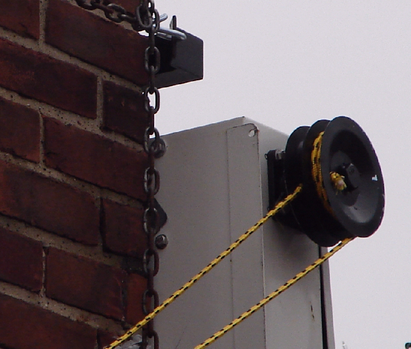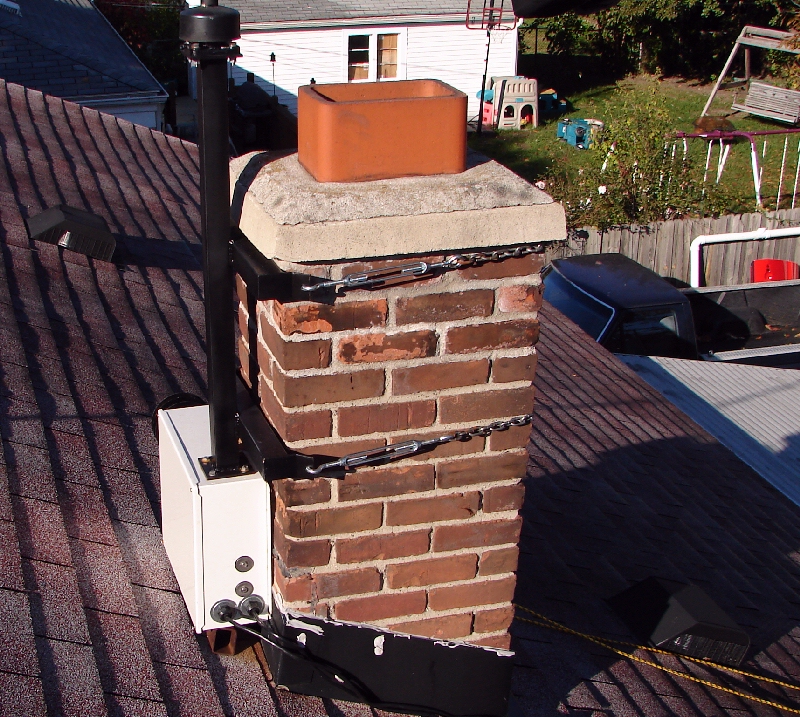 The whole assembly is attached to the chimney with chains. The chains are tightened with turnbuckles. This view shows the top bearing and the rain shield. The rain shield is made from a 4" thinwall PVC cap and a 3/4 coupling glued into the center. This is held in place with a tight fitting o-ring . This keeps the rain from running down the driveshaft and into the electrical / motor box at the bottom. Instead of attaching to the chimney a roof support pole could be added to the house, or even a large set of legs and feet could be made to sit on top of the roof. With this method It would require guy wiring to the corners of the roof or maybe even the ground.