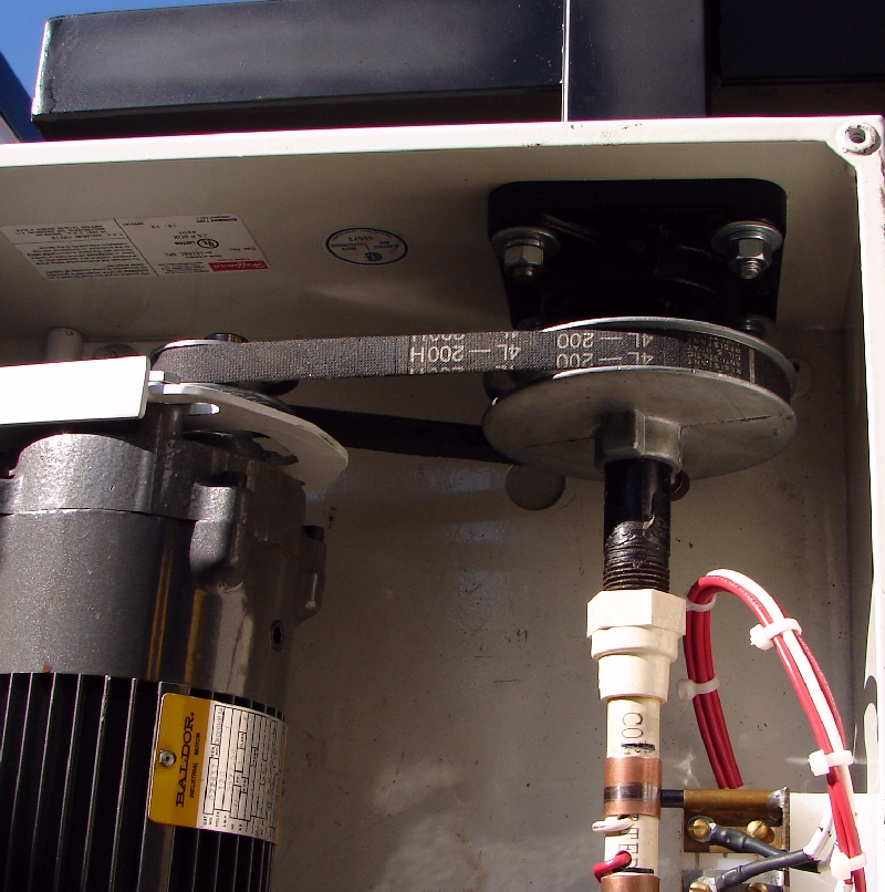 Inside the electrical/motor box is a Baldor 25RPM gearmotor. This has a 2" 4L V belt pulley. This drives the 1/2" steel pipe drive shaft with a 4" pulley. At the end of the driveshaft is the slipring. The main driveshaft is supported with a 1" square spherical bearing pillowblock on each end of the 2" X 2 X 1/16 support tube. One is located on the top inside the enclosure.