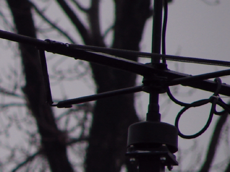 This is a closeup of the spring assembly. There are two drive arms welded to the main drive shaft with a washer on top of them as a bearing surface. Then another set of arms is welded together with a washer on top and bottom. This arm setup is also reinforced with some 1/2 X 1/2 angle stock. There are some S hooks also welded to the ends of each arm. The top simply rides on top of the one that's welded to the driveshaft. It is free to swivel. Then the two screen door springs are installed between the set of driveshaft arms and the swivel arms. This allows a certain amount of wind gust to be absorbed by the springs. The swivel arm assembly is what the booms slide into. The 5' 1/2 EMT conduit boom slides into