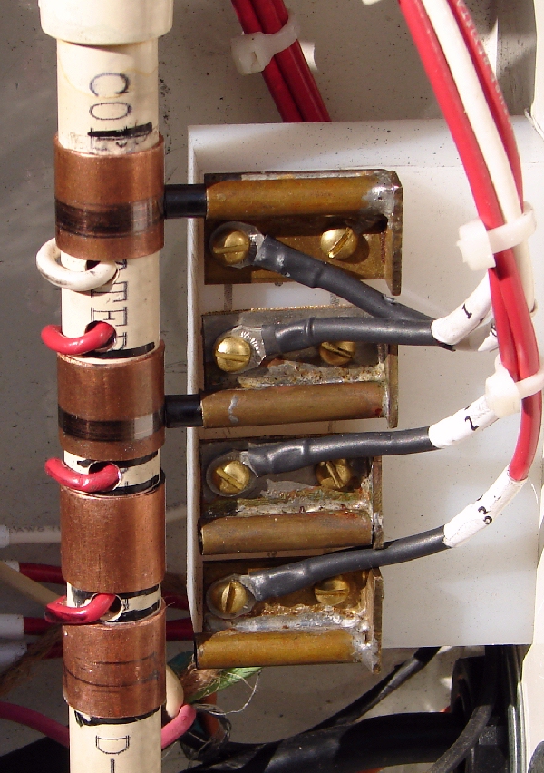 Heres how its made. The end of the dirveshaft is threaded 1/2"NPT. On this is attached a 1/2" female to 1/2"CPVC adapter. This adapter has a 5" piece of CPVC pipe glued into it. The pipe has holes drilled into it for the boom wires to come out. Next to each hole a portion of a 1/2" copper "slip" coupling is epoxied. Each boom supply wire is soldered to a coupling. This completes the moving half of the slip coupling.