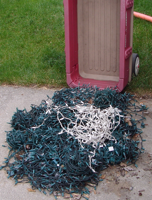 And just to show everyone I'm not a miracle worker when it comes to Christmas lights this is my pile of BAD lights from the 2006 season. This is also one of my 2007 summer projects:(