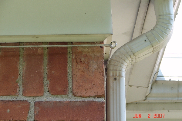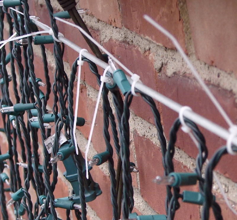 Another alternative for hanging lights is cup hooks. I use quite a few of these as well. I use them where I don't or can't use the steel cable or when they just plain work better. They are use around all of our windows. I use a 24" piece of 1/2" PVC to put the lights up on the windows because the cup hooks are so easy to attach lights to. When using them in a place where the weather can get to them. Install them first using a small drill bit in a cordless drill to make a pilot hole then thread it in. Then remove it and put a dab of silicone caulk on the thread to seal the hole and to help hold it in the thin aluminum siding or trim.