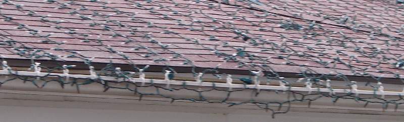 There are several things I use to hang lights. Let's start from the top down. The first few years the roof was a little neglected because I couldn't figure out how to put the lights up there. Well as you can see from the picture I did figure that one out. From my local Target store I found these clips. They work very well on the roof. I use about 400 when I cover it. I start on the gutter where I put the clips every 5". They snap on and will hold several types of lights, including minis, c9's,and rope light.