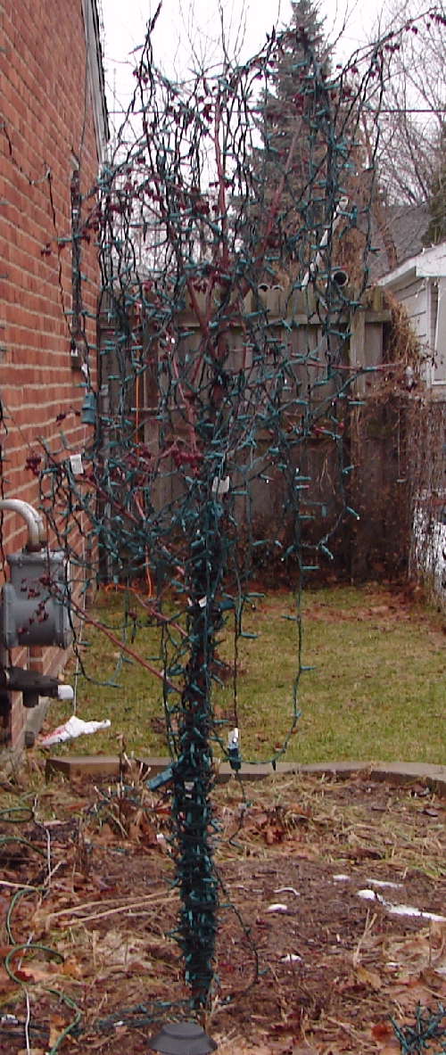 This is a picture of the poor little crabapple tree that I loaded with 1000 lights. I don't advise this for tree huggers or the faint of heart;)