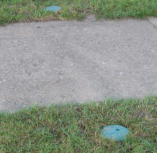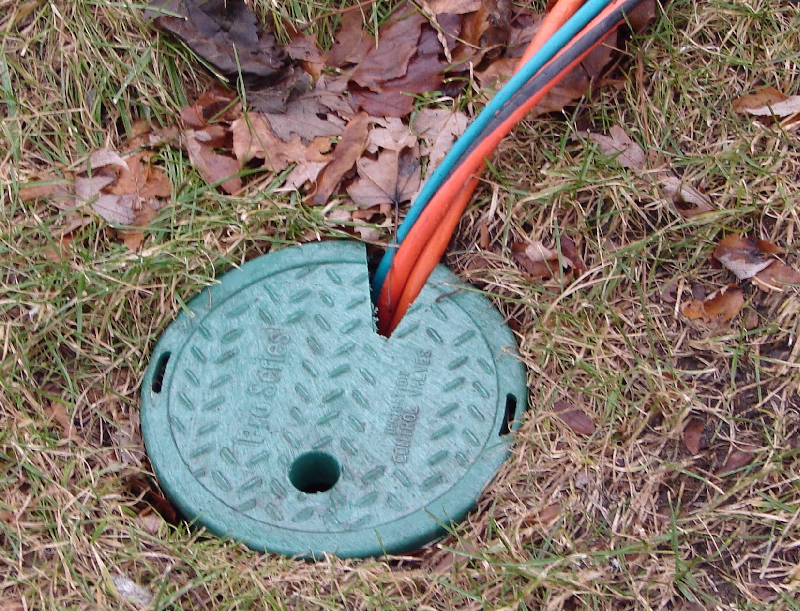 After loosing a few lights to a snowblower incident I thought it would be a good idea to come up with an alternate method to get past the sidewalk. So I got two sprinkler valve boxes and dug a hole on each side of the walk. The far hole in the picture ended up being quite long so I could drive a steel pipe under the sidwalk. Unfortunately there were a lot of roots in the way which made the going tough.