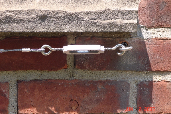 Then the cable is attached and stretched tight with a stainless turnbuckle with one end opened slightly. The lights are fastened with wire ties to the cable on the top and staked into the ground with wickets on the bottom.