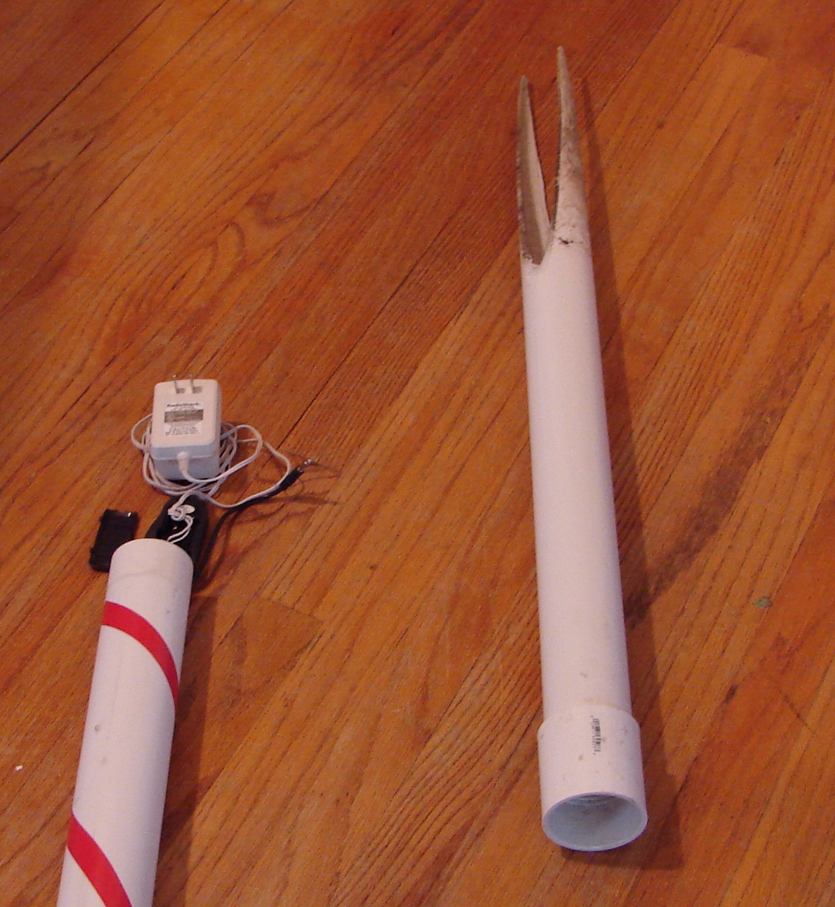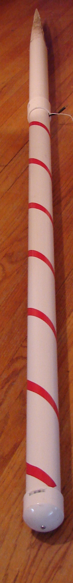 The next challenge with this transmitter was putting it outside. It was not designed to be out in the weather. So an enclosure was made. It just so happens to look like a North Pole.... PVC is used for the pole and a coupling and cap were used for the mid junction and the top cap. The bottom of the pipe was cut to a point so it could be stuck into the ground. At about 2' off the ground The pipe was cut so the point once frozen into the ground could be left there and still allow the top to be removed mostly for battery replacement. This held up great ffor the 2006 and 2007 seasons and will probably used for several years to come.