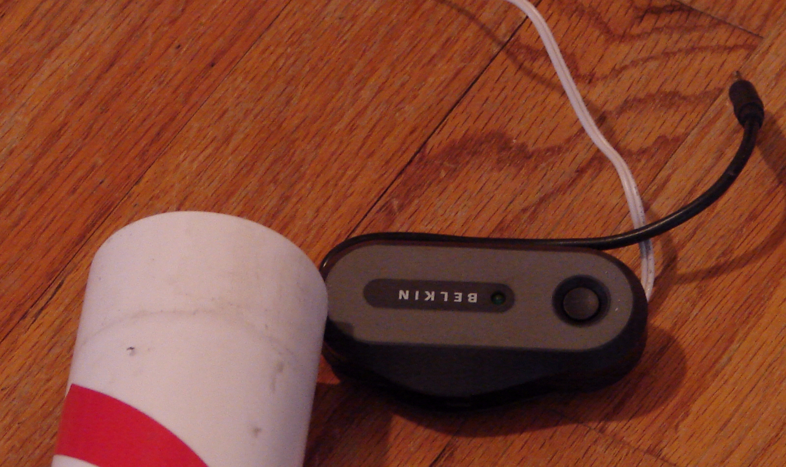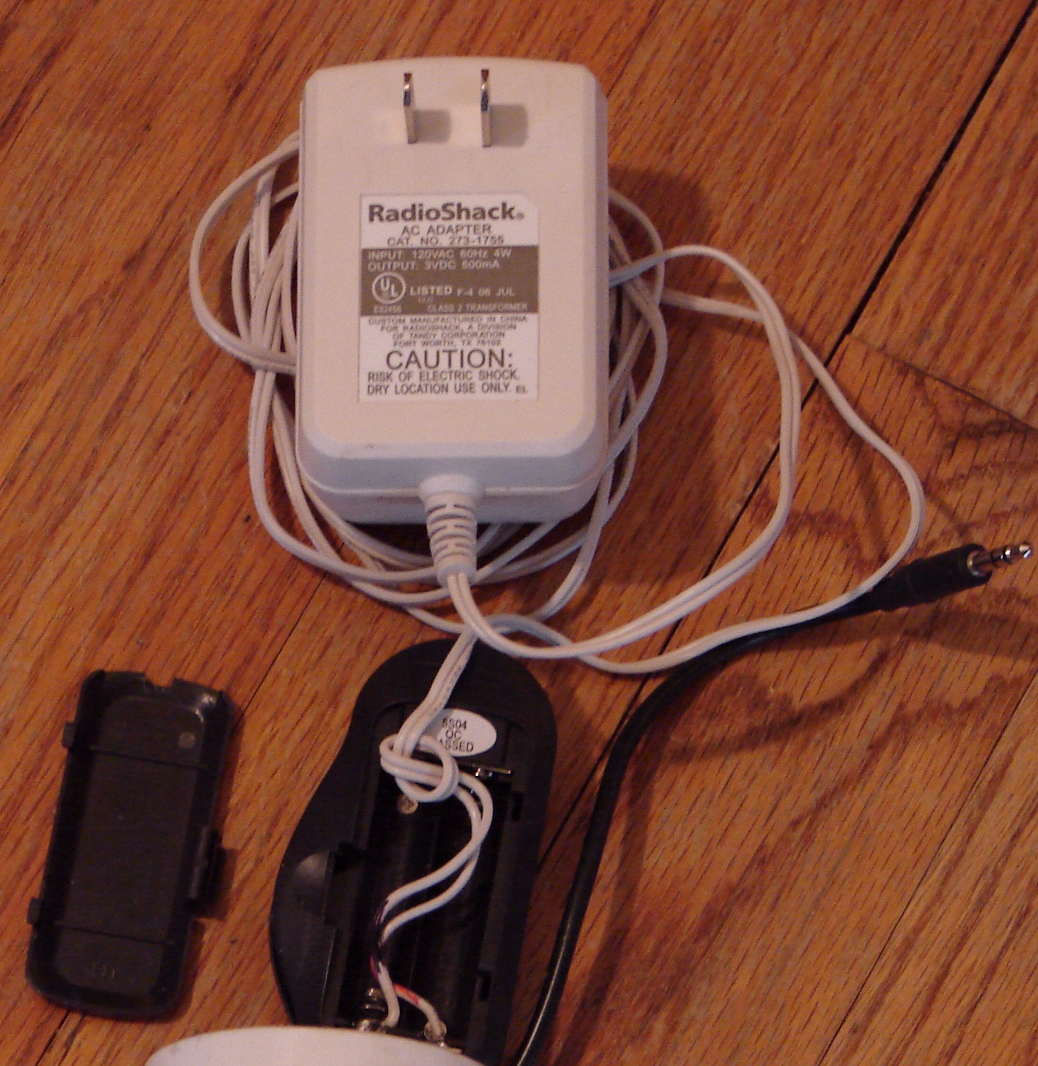 During the first week over a dozen battries were used so a Radio Shack 3VDC power source was used. It has been soldered to the battery terminals inside the Belkin battery holder. Then a small notch was cut into the cover to allow the wire to exit. To allow the transmitter to be mounted closer to the street a 100' cable was made to extend the stereo output of the computer to the middle of the front yard. It uses 2 conductor shielded cable and a male and female 1/8" stereo jacks from Radio Shack.