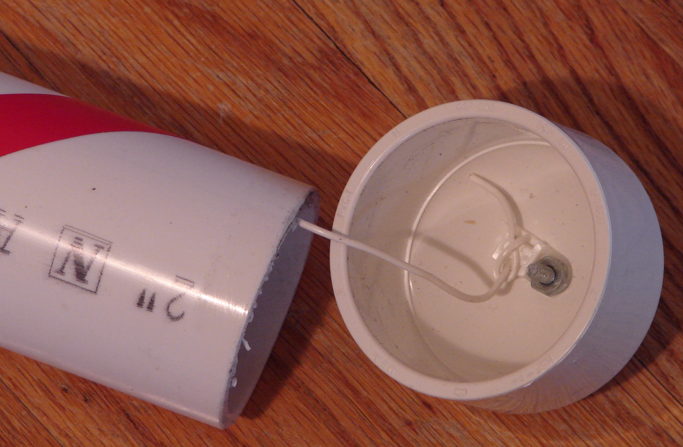 In the bottom of the north pole PVC I cut a slot into it so the cords can exit. I made the pole to come apart like this because originally I had to be able to turn the transmitter on and off and to replace the batteries. Unfortunately the batteries had to be replaced every couple of days. So I switched to the wallwart from Radioshack. Now it is hooked to the static channel of my Light O Rama setup.