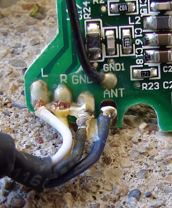 This is the bottom left corner of the circuit board. It has four wires soldered to it. There is left input, right input, ground, and antenna. They are labeled on the board under the wires. In this view the wires have been bent back out of the way for the picture to show labeling. I don't suggest doing this mor than once of twice or the wires will fatigue and maybe break. The wires are fastened in with hot melt glue. So the first step is to remove the glue from the antenna solder pad with an exacto knife. If you don't the glue will remelt make a mess and contaminate the solder pad making it hard to resolder the new antenna.