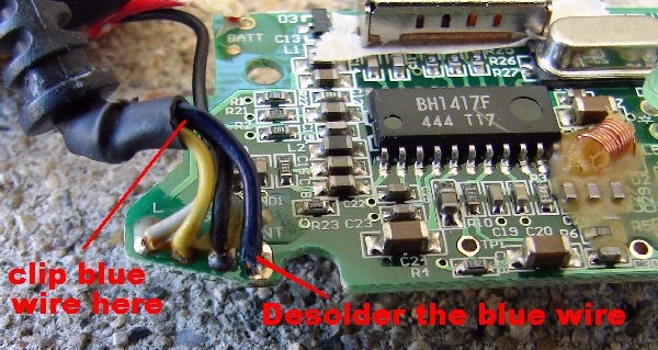 With the glue removed clip the blue wire where shown in the picture. Once cut get a soldering iron hot and grab the wire with needle nose pliers and desolder the wire. The new longer antenna wire can now be soldered in. The length is critical depending on its transmitted frequency. There are many websites that can calculate this dimension for you. Here's one, or you can do a search for antenna lenght calculators. My length for 88.5 FM was 31.73" so I soldered in a 20awg stranded wire 36" long then cut it to length. I used this frequency because there are no stations for 100 miles using it. The Belkin modifiedwas more than powerful enough to transmit over the noise.