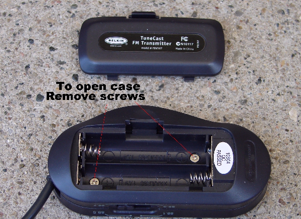 This is the back ot the Belkin Tunecast. When you remove the battery cover. You will see two screws. Use a #1 phillips screwdriver to remove both of them. After you remove them the case can be split at it's center seam. When doing this notice how the channel selector switch slider goes back in. When you get it apart the circuit board will now come out.