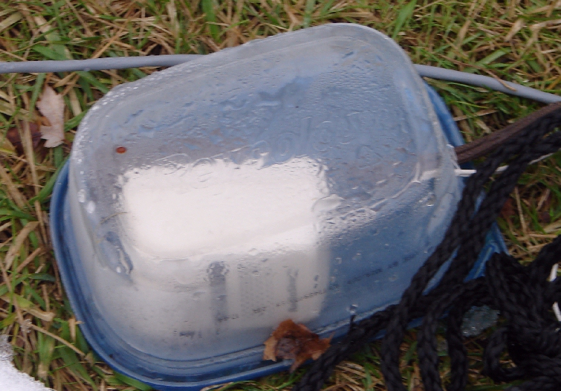 The wallwart power supply is hooked up to my static channel on my LOR setup. This connection was tucked away nice and dry in a food storage container with a small notch cut into it fot the wires. It looks like its all wet in the picture but it is actually dry the water is on the outside.